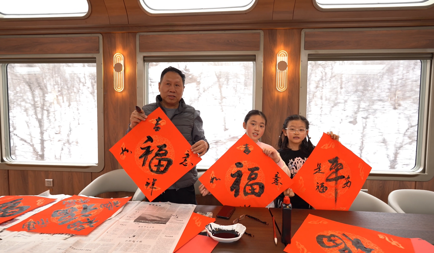 在會(huì)議車廂,司乘人員為乘客準(zhǔn)備了筆墨紙硯,大家紛紛拿起毛筆,揮毫潑墨。一副副春聯(lián)和福字在大家的筆下誕生,有的蒼勁有力,有的清新秀麗,為蛇年春節(jié)增添了文化氛圍。心靈手巧的游客還拿起剪刀,將一張張紅紙剪成各種各樣的圖案,這些精美的剪紙作品不僅是藝術(shù)品,更是游客對(duì)新年的美好祝福。